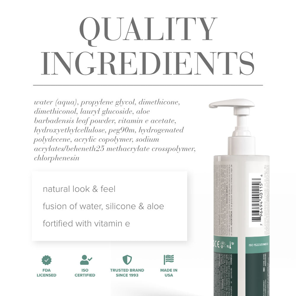 Ingredients: Water (Aqua), Propylene Glycol, Dimethicone, Dimethiconol, Aloe Barbadenis Leaf Powder, Vitamin E Acetate, Hydroxyethylcellulose, Polysorbate 20, PEG-90M, Polyisobutene, Acrylic Copolymer, Polyacrylate 13, Chlorphenesin