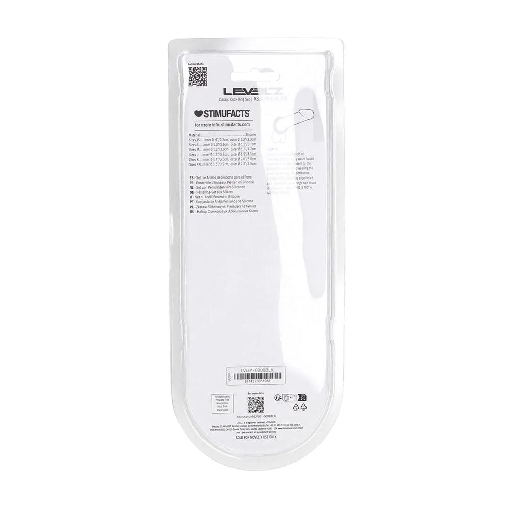 Step up your game with this essential trio from the LEVELZ collection. This non-vibrating set includes three body-safe silicone cock rings in XS, small, medium, large, extra large, XXL and perfect for shaft, cock & balls, or stacked wear. Each ring offers a different fit and feel, letting you customise your experience. Packaged in a sleek, merchandisable clamshell for easy display and storage.
